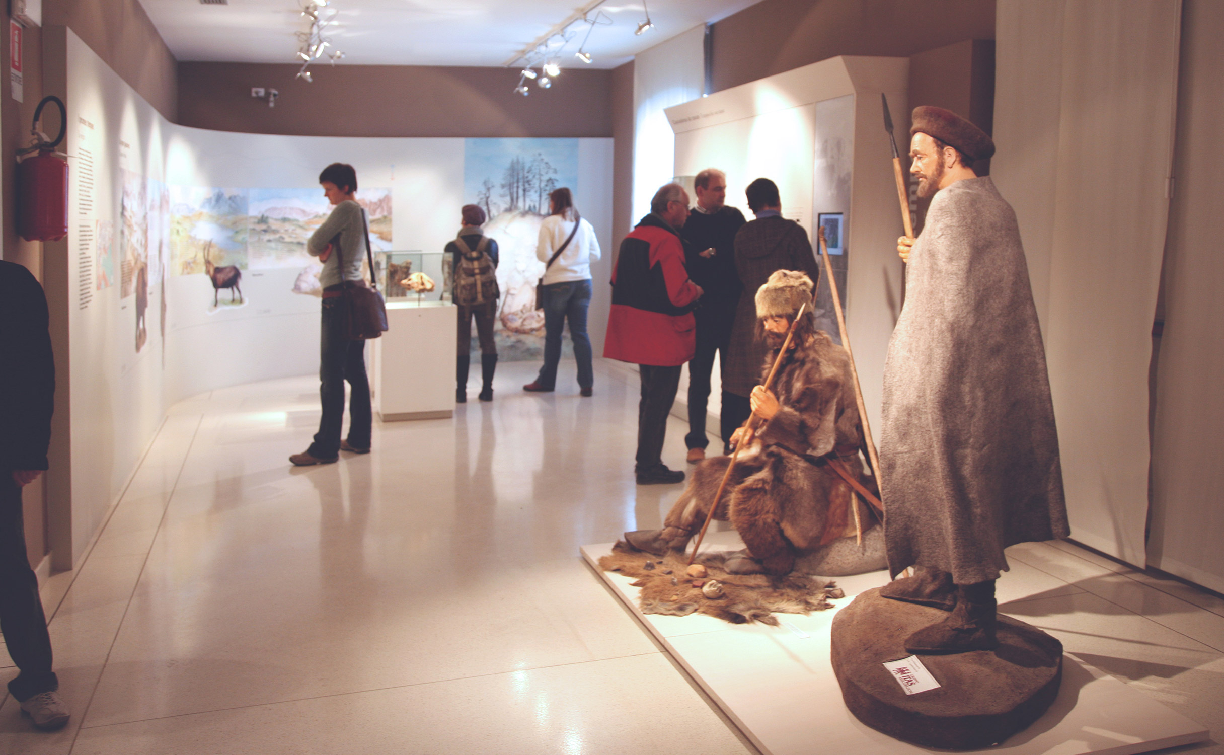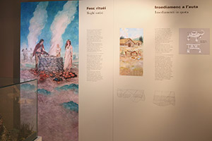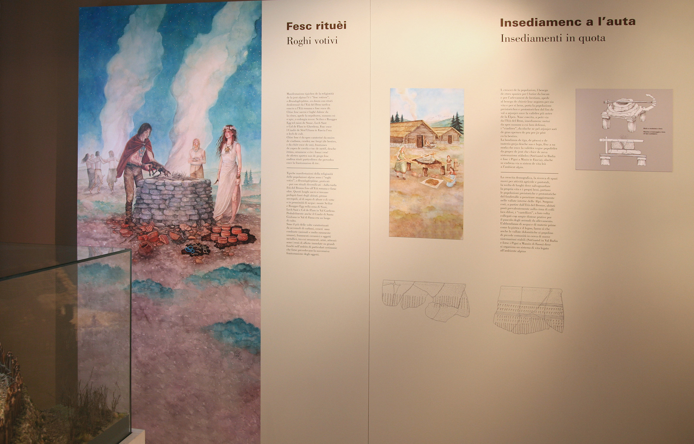 Hinweis: Der abgebildete Hund ist historisch nicht korrekt: Hunde in der Art von Jagdhunden kommen erst ab dem Mittelalter vor; es war eine Hommage an meinen damaligen Hund Matisse. Aquarell und Tempera auf Papier ca. 100 cm x 80 cm, 2002 - Museo Ladino di Fassa.