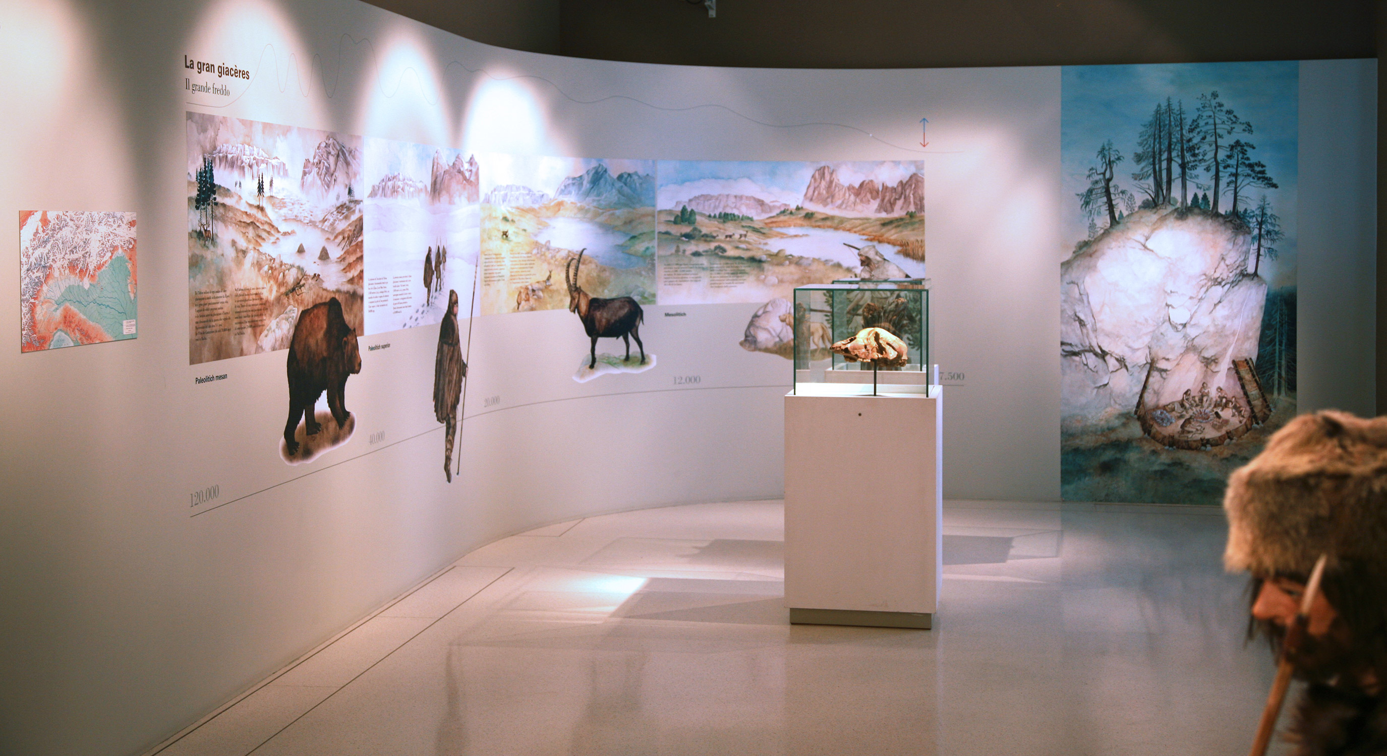 DE: In einer Höhle am Piz Cunturines im Gadertal wurden Knochenreste des Ursus Ladinicus gefunden, der vor 60.000 bis 30.000 Jahren lebte. Im Hintergrund links ist das Sellamassiv zu sehen, das Symbol der ladinischen Täler (Dolomiten), die sich von ihm ausbreiten. Um diesen Konvergenzpunkt und geografischen Bezug in den vier Dioramen zu betonen, habe ich mich dafür entschieden, das Sella-Massiv immer von der gleichen Seite zu zeigen. Aquarell und Tempera auf Papier ca. 100 cm x 80 cm, 2002 - Museo Ladino di Fassa.