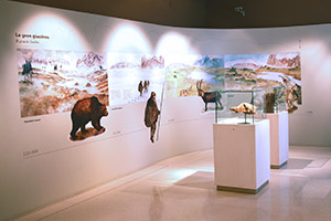 IT: In una grotta sul Piz Cunturines in Val Badia, sono stati ritrovati resti di ossa dell’Ursus Ladinicus, vissuto tra 60.000 e 30.000 anni fa. Sullo sfondo a sinistra si riconosce il massiccio del Sella, simbolo delle valli ladine (Dolomiti), che da esso dipartono a raggiera. Per accentuare questo punto di convergenza e di riferimento geografico nei quattro diorami, ho scelto di mostrare il Massiccio del Sella sempre dallo stesso lato. Acquarello e tempera su carta 100 cm x 80 cm circa, 2002 - Museo Ladino di Fassa.